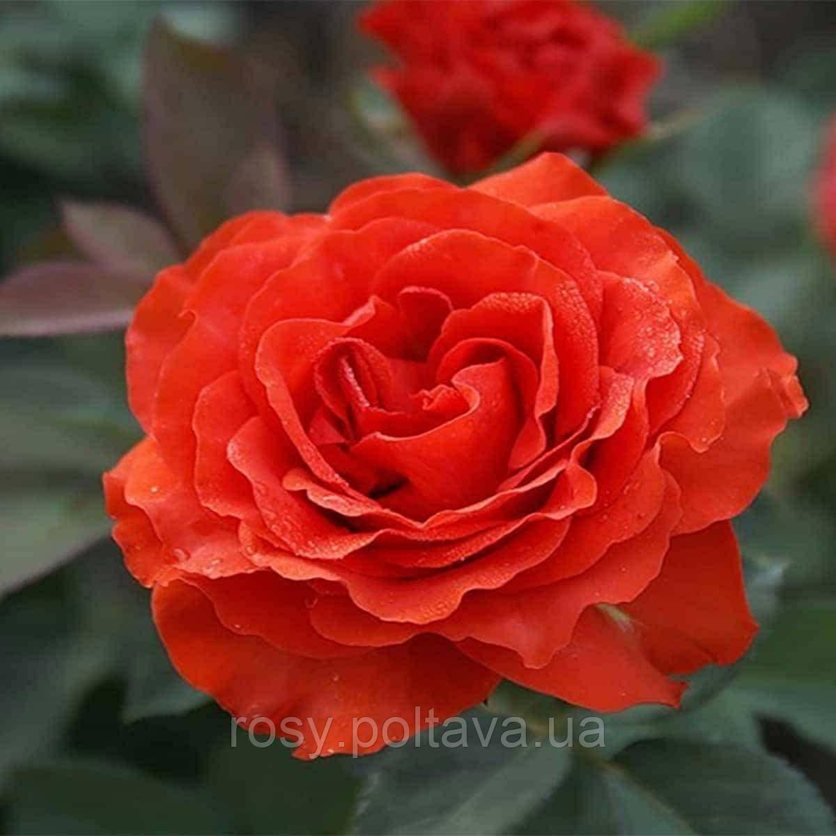 Квіти криваво-червоного (червоно-оранжевого) кольору, розташовані по одному на дуже потужних квітконосах, квітка тримається 3-4 тижні, діаметр квітки близько 10см, з часом вигоряє, але при цьому не втрачає своєї привабливості, пелюстки гофровані. Листя темно-зелене з червонуватим відтінком. Кущ компактний, рясний. Роза відрізняється оригінальною формою пелюстки. Різьблені і великі вони можуть бути і яскраво-червоного, і кривавого, і темно-оранжевого кольору. На різних стадіях цвітіння забарвлення троянди може переходити на 1-2 тони в темну або світлу сторону. Іноді від променів сонця на пелюстках утворюється темно- червоне, майже чорне напилення. Аромат слабкий. Кущ має прямі рівні пагони, без шипів, що робить сорт ідеальним для зрізання. Листя середні, різьблені, темно зеленого кольору.