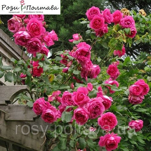 Одна з кращих в'ющих троянд для невеликих садів. У неї величезні квітки, і кущ не виростає занадто високим. Квітки яскраві насичено-рожеві або вишнево-червоні, блідіше до країв квітки, і іноді з пурпуровим відтінком в центрі. Зворотний бік пелюсток трохи блідіше і більш сріблястий. Квітки чашоподібні, такі густомахрові, що під їх вагою часто гнуться пагони. Це хороша риса, тому що це означає, що дощ їх не зіпсує, а ми зможемо заглянути всередину квітки. З'являються по одному або в кистях до 5 шт. Листя рясне, темно-зелене, стійке до захворювань. Кущ сильнорослий і дуже рясний.